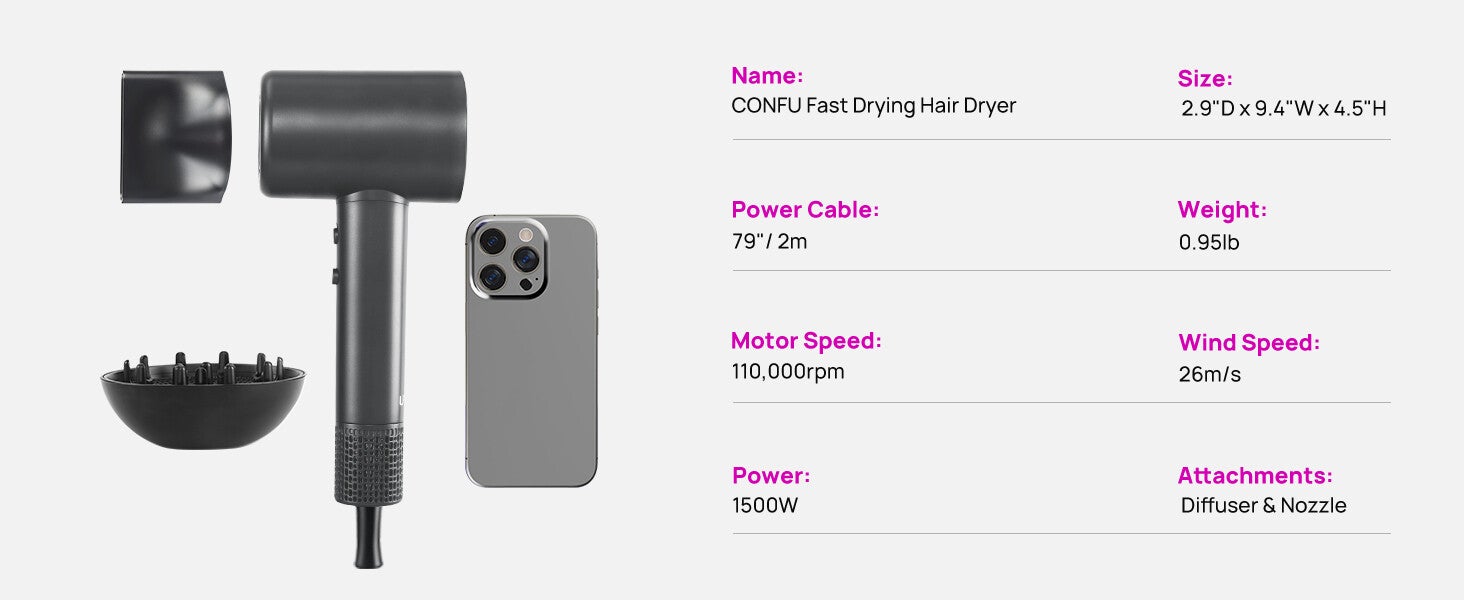 - High-speed 110,000 RPM motor for fast, efficient drying without heat damage.